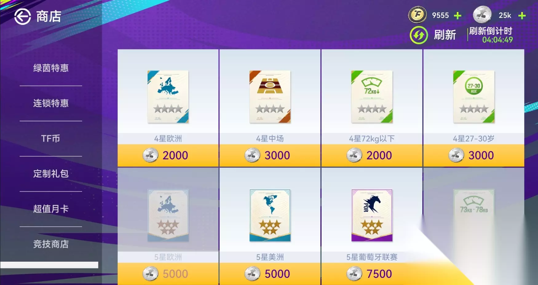 抽卡我们分为合同卡池&限时卡池(都有累计抽卡次数保底)合同卡池:常驻,卡池由当前赛季普卡以及球探卡为主。需要用合同进行抽卡。有保底,保底为30抽(提前抽中保底会重置)限时卡池:有限定时长,到期后会更换主题。卡池由卡池主题球员卡为主,需要用TF币或签约信进行抽卡(部分卡池不支持签约信,需要以具体上线的卡池为准)且只有累计抽卡次数保底。 兑换商店