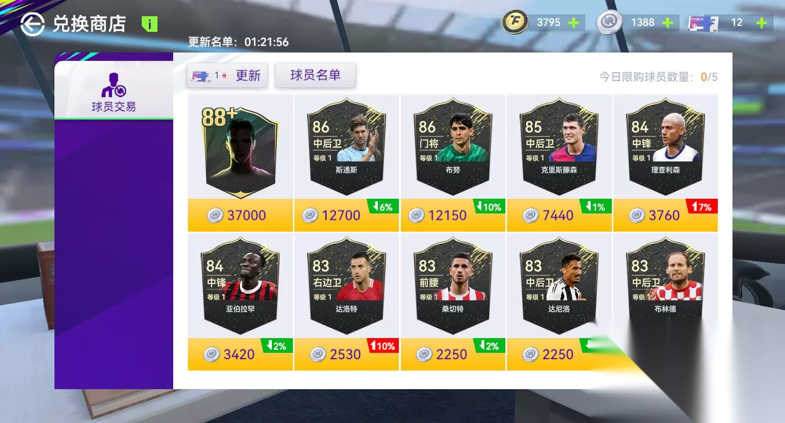 商店限时刷新当前赛季黑卡,可以使用转会币直接购买球员。商店也可以自行刷新,当日首次刷新免费,第2-3次需要1张刷新券,第4-5次需要2张刷新券,第6次开始需要3张刷新券,次日0点重置。注:球员名单为可以在商店里购买的球员以及购买价格展示,此处无法购买球员,需要在刷新出的球员中进行购买。 球员转会(原组合交换)