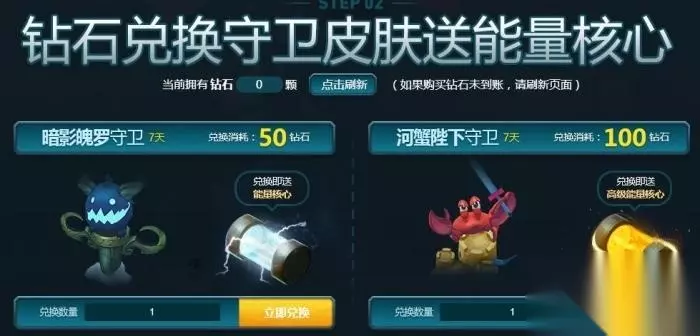 2、使用钻石来兑换暗影魄罗守卫或者河蟹陛下守卫,可以获得能量核心或者高级能量核心;