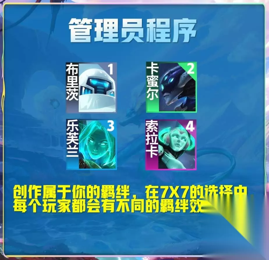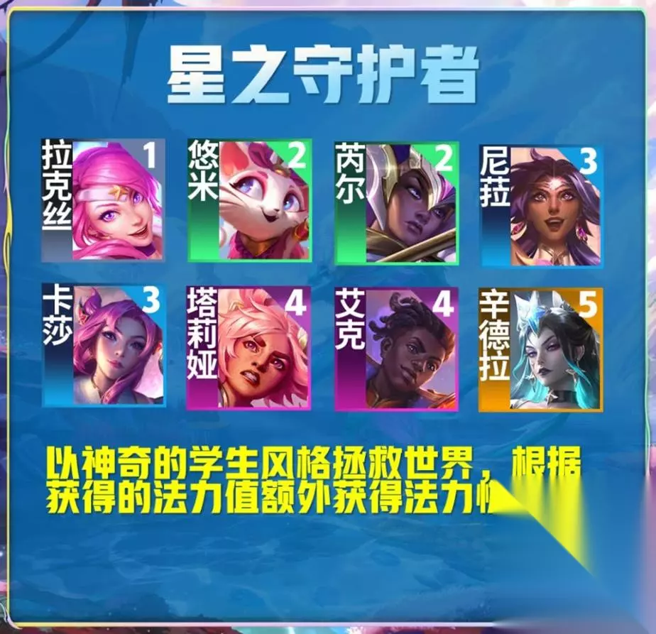 所知成员:乐芙兰 卡蜜尔 布里茨 索拉卡 【星之守护者】羁绊越高,生成的法力值越多
