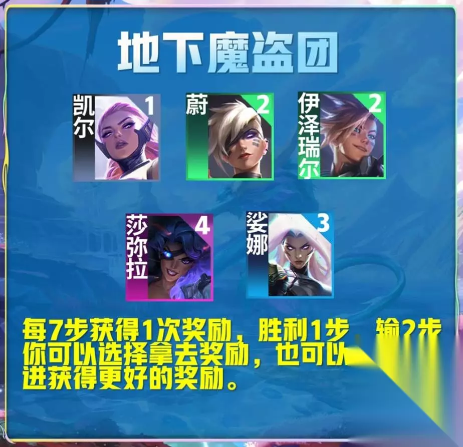 所知成员:卑尔维斯 扎克 拉莫斯 【地下魔盗团】每次胜利前进一步,失败前进两步,到达七步后获得奖励