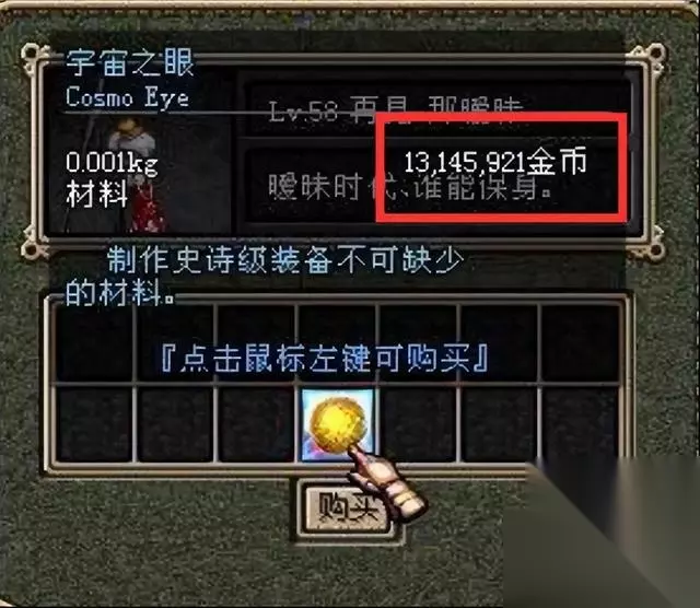 对于宇宙灵魂大家很是熟悉了,但这个宇宙之眼怕是绝大多少玩家也是第一次听到的吧。而其实也只有那些经历过60版本的老玩家才知道这个材料的存在,即使是放在当年这个材料也是价值不低的,一个就卖到了上千万金币了,这在当年简直就是天价啊。