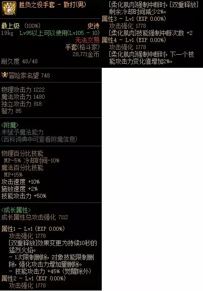 该词条不可累加,等同于全技能固定加成2%。 数值对比 【武器特化提升】 110版本不算装备影响,武极10s(一套技能)中二档、三觉、非觉醒技能占比分别是10%,30%,60%左右,胜负之役武器的属性1通过牺牲占比较低二档,换来占比较高的非觉醒技能45%加成,将职业的10s爆发能力提升到了全职业前茅的水平。 属性2参考韩服及国服先遣服实测,修炼场和实战中通过持续使用“柔滑肌肉”可以将2档周期缩短到40-60s左右,通常情况下“柔滑肌肉”熟练度越高,输出环境越好,该属性减2档cd效果越好,因此若要完美驾驭这把武器,对玩家的操作和副本熟练度也提出了更高的要求。 【CP制式提升对比】 三觉:胜负之役和制式武器基本持平; 非觉醒技能:胜负之役武器开2档比制式武器高38%-43%(平均40%),胜负之役武器不开2档比制式武器低1.4%-4.5%(平均2.5%)。 总结 【玩法特点】 胜负之役武器2档期间(10s内)和非2档期间伤害差距较大(非觉醒技能差距45%),因此110版本适用于两种玩法: 第一种是持续爆发玩法,通过搭配减cd装备增加技能可柔滑次数,缩短2档爆发间隔,在110版主流副本中实现一到两个精英怪或boss即可使用一次二档。 第二种是纯爆发玩法,通过搭配纯爆发装备将核心输出能力集中在二档10s期,以便在最短时间内带走副本boss和棘手的精英怪。 【数值提升】 胜负之役武器开2档10s(含觉醒)比制式武器高10%以上,4s(不含觉醒)比制式武器高40%左右,爆发输出能力明显高于制式武器,不开2档期间虽然比制式武器低3%左右,考虑到可以通过“柔滑肌肉”技能和搭配减cd装备减少2档cd,胜负之役武器的爆发周期比制式武器更短,持续爆发能力因此也更强。 【装备搭配】 持续爆发玩法可搭配复读手环(手镯),战术雷电网或者骤闪指环(戒指),士兵荣耀项链(灼烧流可选),无色晶钻或者被诅咒的枷锁(出血流可选),黑色夹克(上衣)等减cd装备,缩短2档爆发间隔,提高持续爆发能力。需要注意的是105装备“增加技能恢复速度”词条越多,减cd效果稀释越严重,建议类似词条装备不要搭配超过两件。纯爆发玩法可搭配无色三件套、黑花的束缚手链(出血异常手镯)、能量储存戒指(机械战神副本产出)等强力输出装备,以特化10s爆发能力。 【武器推荐】 胜负之役武器在保留职业特色(爆发快且续航较好)的前提下,通过较少牺牲1s爆发换来更强的10s爆发,并且对职业以往的玩法和输出模式做了“高操作高回报”的改变,由于110版本前期“毁灭的寂静城”、“机械战神实验室”等主流副本具有精英怪较多,撤退不重置技能等特点,使用胜负之役武器的玩家可以通过熟练运用“柔滑肌肉”反复使用2档,实现“厚积薄发”,因此从实用性、可玩性、武器特效等角度对比,胜负之役武器相比制式武器都是不二之选。 以上就是小编为大家带来的攻略介绍了,如果《DNF》男散打CP武器解析的这篇攻略有成功的帮助你解决你目前遇到的问题,那么就在评论区留言告诉小编,小编会为你去寻找更新更全的解决方法来帮助你。 DNF2020活动 欲望之塔