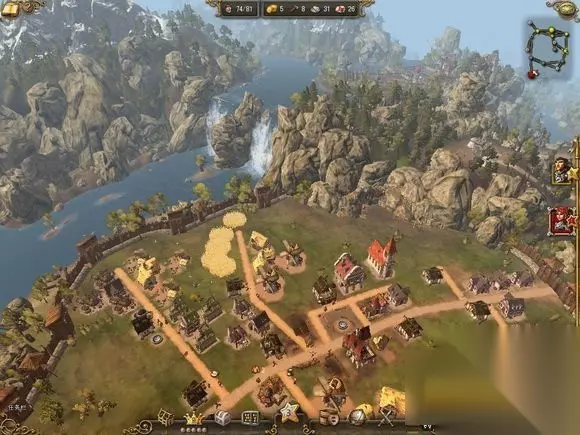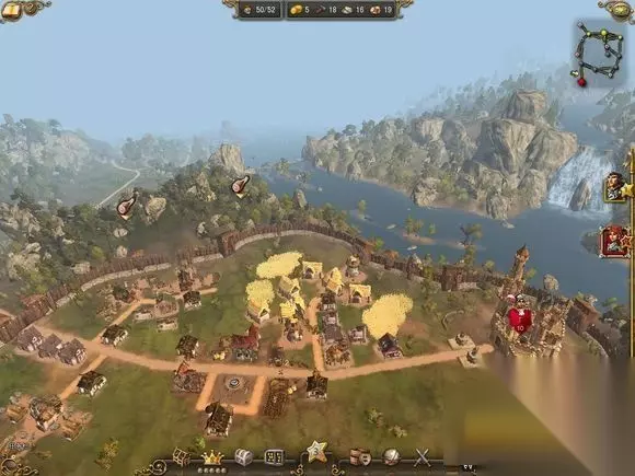 第二阶段如图.所示 2大威望建筑[选择开启教堂,要塞,交易所] 农屋 + 2谷仓 1风车 ;农屋 + 2谷仓 1风车 ;住房 + 2面包房 1酿酒房 再再在适当的地方补个住房保持人口和仓库保持物流顺畅。 这样普通食物的生产链就完成了,可以为后面生产衣服的裁缝们准备好食物。啤酒生产到18杯后可以停止工作甚至可以把它拆了。森林里的动 物资源开始枯竭就把一个猎人小屋拆了。屠户也可以拆掉一个。 图2.右下角你会发现那里被我用来当做住房建造地了- -。这游戏规划土地比较重要,好好利用每一寸土地。