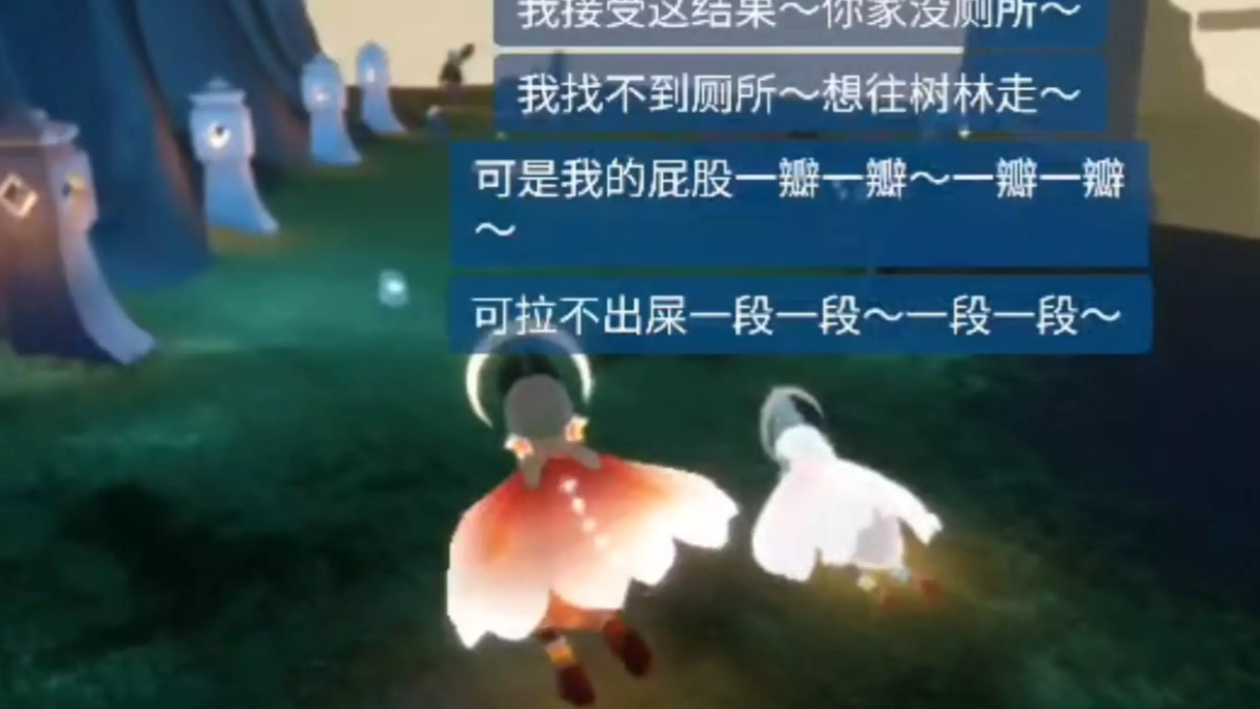 这是《光遇》相关的娱乐视频,视频前半段是博主和朋友演绎的内容,后半段是博主在暮土遇到全物品外挂的真实经历,博主借此视频呼吁大家不要开挂。