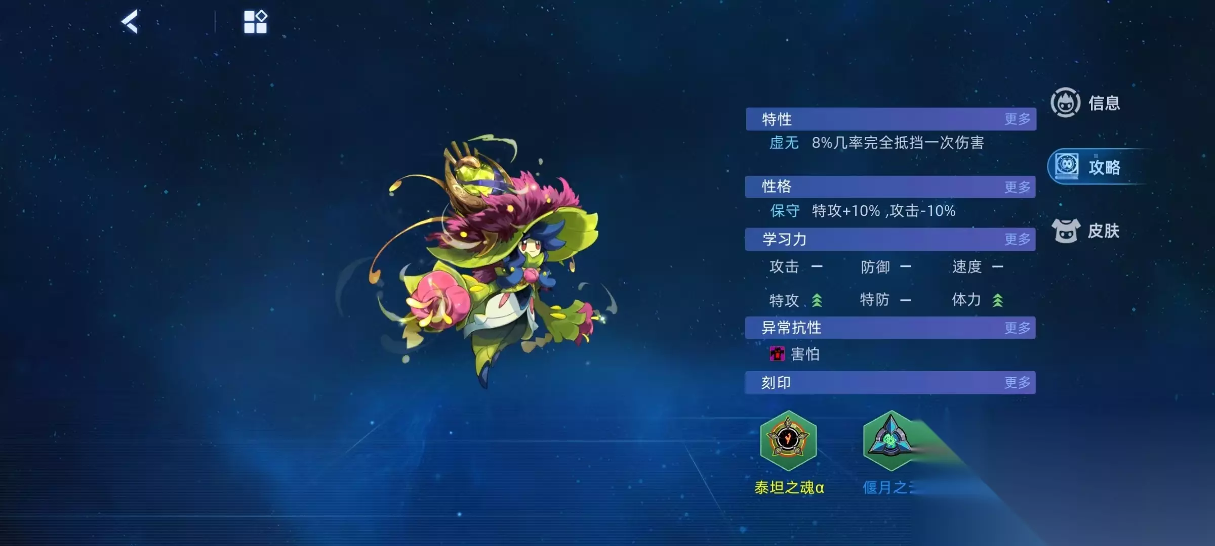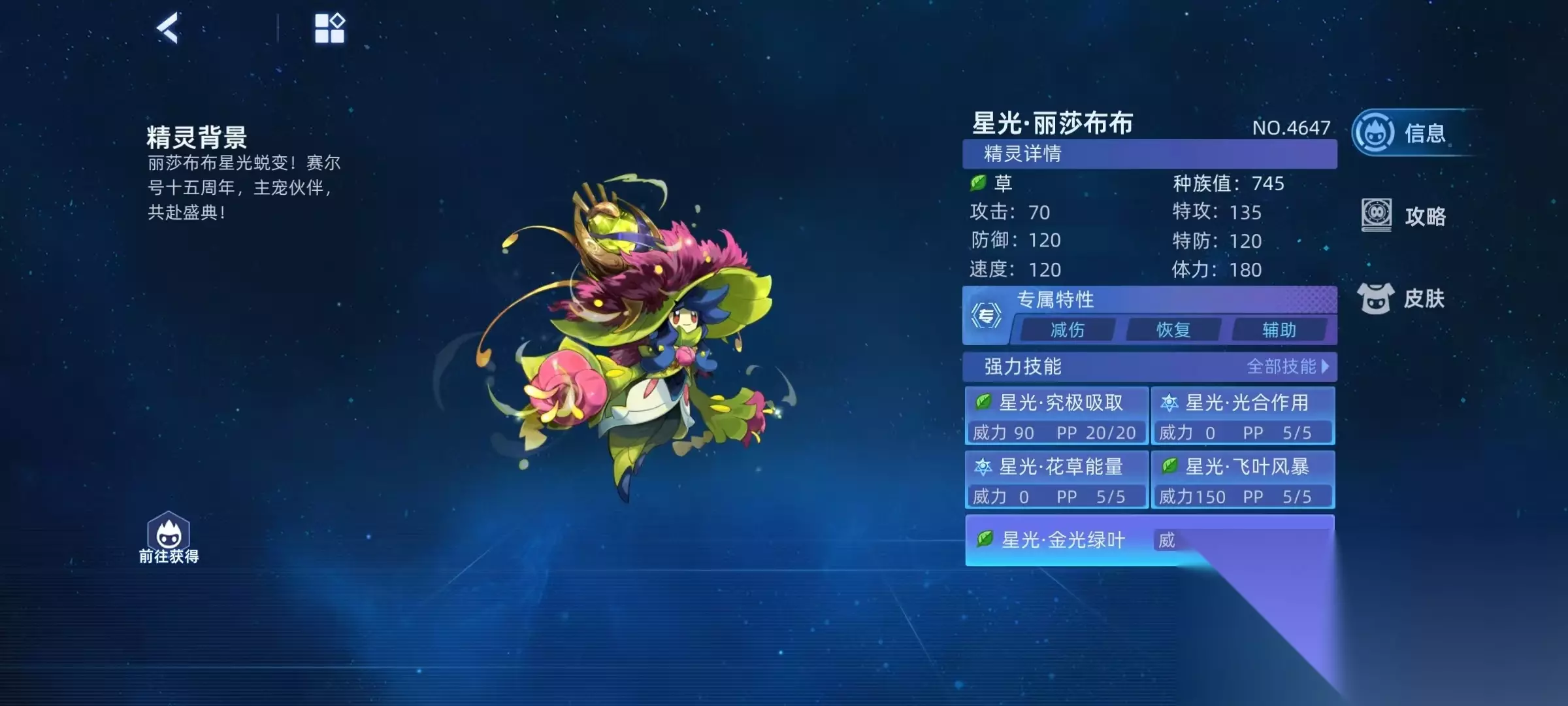 星光花草能量,在自身当前体力高于对手时,强化效果翻倍,之前全属性加1,翻倍之后全属性加2。当自身体力高于对手时,获得400点护盾,如果自身体力低于对手,则恢复最大体力的1/2,抵挡下一次对手攻击。星光金光绿叶,对手回合类效果消除,成功后下回合受到的伤害转化为自身体力,降低对手所有pp1点,并恢复自身所有pp1点。当对手处于星海之浸时,造成的攻击伤害提升75%。后续培养的时候,特性选择虚无最佳,性格选择保守最合适,学习力提升特攻和体力,异常抵抗选择免疫害怕。