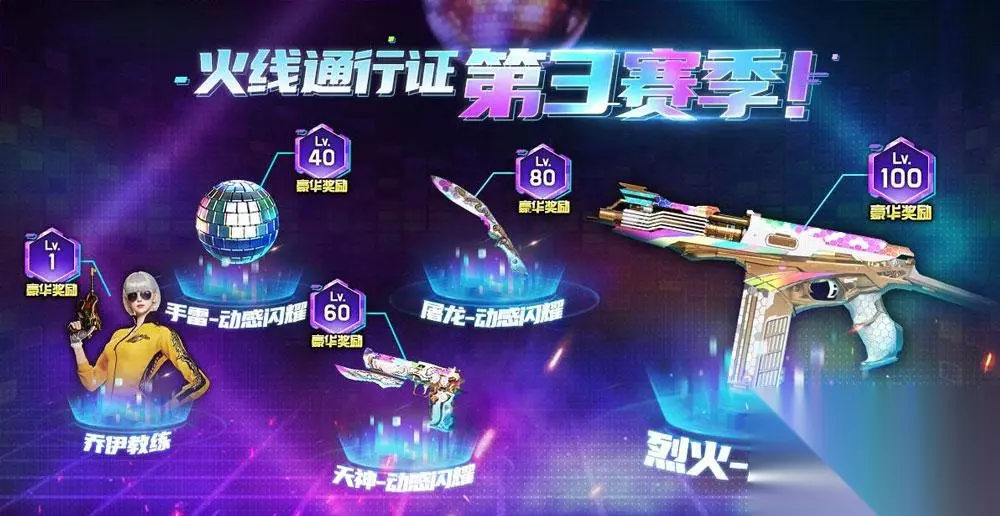 cf第三赛季通行证终于迎来了打折,可以获得四把英雄级武器(烈火-动感闪耀、手雷-动感闪耀、屠龙-动感闪耀、天神-动感闪耀)以及角色乔伊教练。