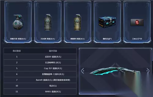 购买数量额外奖励1尼泊尔-雷霆(永久)2巨龙咆哮III (永久)4炫(永久)5Cop 357-雷霆(永久)6M4A1-雷霆(永久) (激活雷霆套装效果)7Barrett-雷霆(永久) 活动期间游戏一局后才可购买惊喜礼包