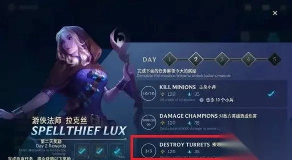 Turrets翻译过来就是指的LOL手游之中的防御塔,所以destroy turrets的任务就是要求摧毁指定数量的防御塔。 新手任务当初要求的数量是3次,而KDA活动第五阶段中任务要求的就是15次了,但是也还是很简单的。