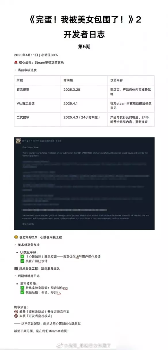 根据最新开发者日志显示,《完蛋!我被美女包围了2》Steam平台审核工作进展顺利,游戏画质将实现显著提升。项目组已于3月29日完成首次审核提交并获得版本认证,在4月1日收到Valve的修改建议后,于4月3日迅速完成二次提交。
