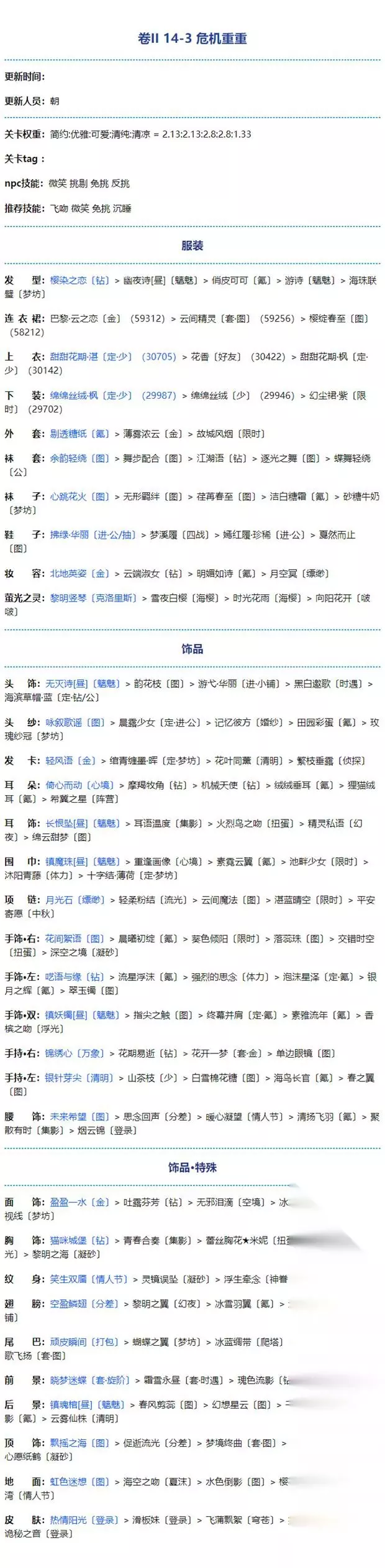 奇迹暖暖危机重重怎么搭配?奇迹暖暖14-3危机重重完美搭配是什么?下面小编给大家整理了奇迹暖暖危机重重完美搭配攻略,快来看看吧! 关卡权重:简约:优雅:可爱:清纯:清凉=2.13:2.13:2.8:2.8:1.33 关卡tag: npc技能:微笑挑剔免挑反挑 推荐技能:飞吻微笑免挑沉睡 这就是奇迹暖暖危机重重完美搭配攻略,希望对大家有所帮助,快去试试吧!