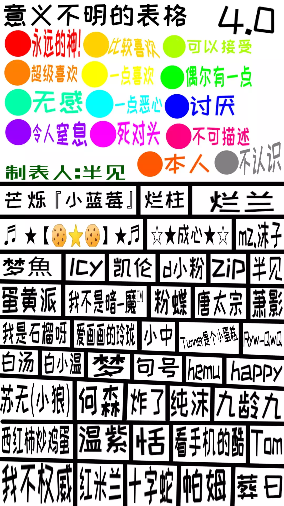 由于半见老师要退游了,所以我来帮他发,以后由我来继续制作这个表格,半见老师说上学的时候会不在,寒假的时候可能会回来的,P4那个空格并不是某个老师的名字,只是我涂掉了而已,被我涂掉的那个入本来就不是这个圈子的并且那个入他也不配呆在这个表格里😊