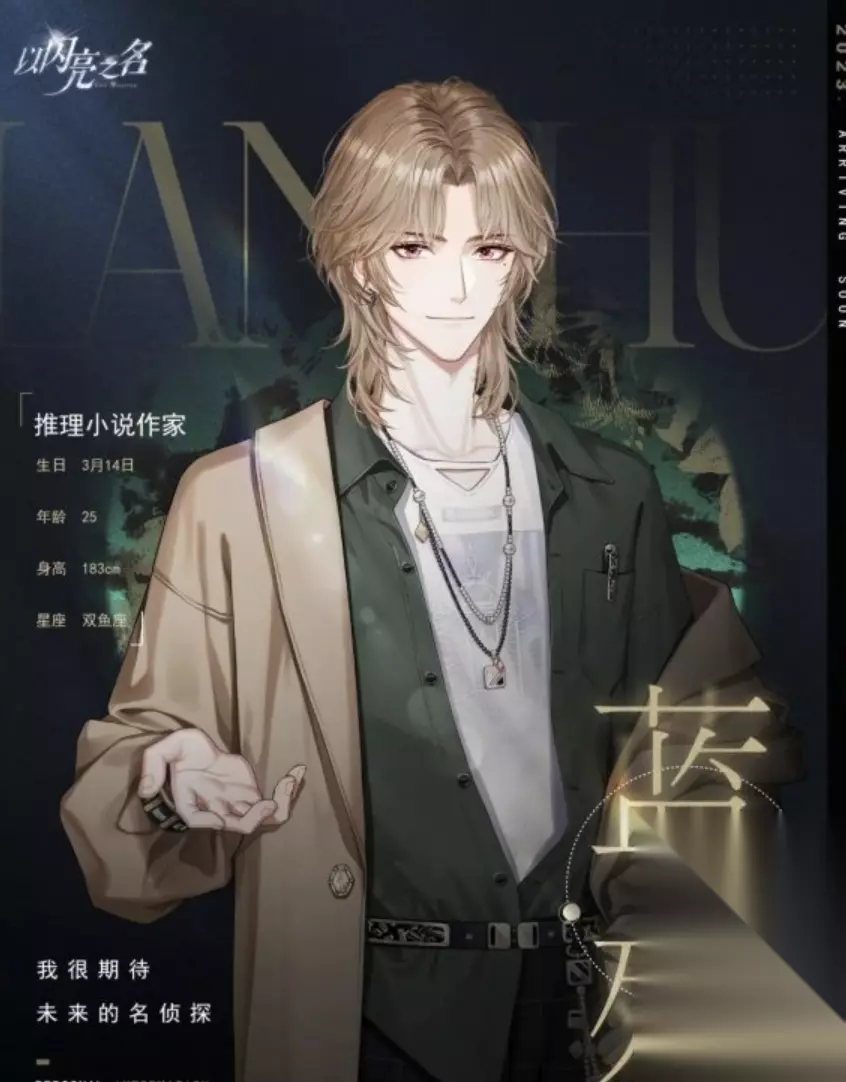 4、蓝殊 蓝殊是一位男性角色,也是可以进行攻略的,他的长相帅气,身份是一位推理小说家。人生就好像是自己写的小说,存在着很多的谜团。一开始接触这个游戏就需要不断的去解开他身边的谜团,当将这个谜团解开之后,发现还有更大的秘密在其中。因此,这个角色的身份还需要确定,身后的谜团还需要更加深层的探索,可谓是神秘感十足了。