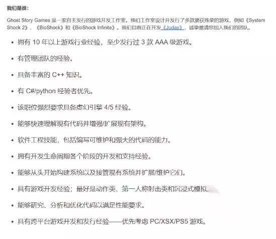 根据T2官方的招聘页面显示,目前该项目正在寻找一位开发人员。好消息是,本作仍在开发中。但坏消息是,Ghost Story正在寻找一名游戏总监,这可属于高级职位,似乎证明开发组内部状况并不太乐观。 “我们目前正在开发《Judas》,需要一名拥有10年以上游戏行业经验,并至少参与开发过3款3A大作的人才来担任游戏总监,非常欢迎你加入我们的团队,”招聘页面中写道。