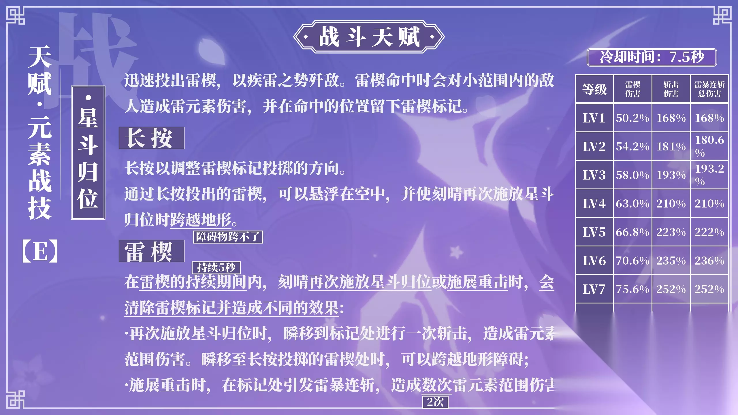 该天赋为辅助兼顾输出的天赋。 元素战技可以施放两次,首次施放是投放雷楔,第二次施放是使刻晴瞬移至雷楔位置。 元素战技的机制与注意点: ◈1、点按有自动索敌功能,会以敌人所在位置为目标位置进行投放,若是对战空中敌人,雷楔停留在空中时,二次施放刻晴不会瞬移至雷楔停留的位置; ◈2、长按可手动调整雷楔的投放位置,不管放在哪儿,只要没有障碍物,在有效距离内,二次施放都会瞬移至雷楔停留的位置;长按大多使用在跑图中,实战中很少使用; ◈3、长按与点按的雷楔命中敌人会对敌人造成雷元素伤害,对应倍率栏雷楔伤害,并对敌人施加弱雷附着; ◈4、雷楔的存在时间为5秒,在雷楔存在期间可使用二次施放使刻晴瞬移至雷楔位置,周围若有敌人会对周围的敌人造成雷元素伤害,对应倍率栏斩击伤害,并对敌人施加强雷附着; ◈5、在雷楔存在期间若直接进行重击(不使用二次施放)会使雷楔直接消失并对周围的敌人造成雷元素伤害,对应倍率栏雷暴连斩伤害,并对敌人施加强雷附着;