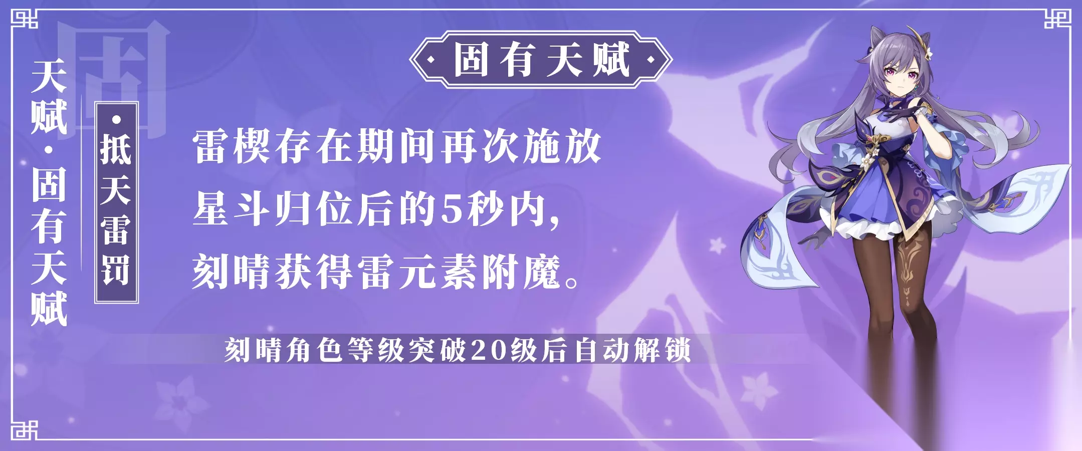【固有天赋·抵天雷罚】 (PS:以下简称“固有1”) 刻晴只需角色等级突破20级即可解锁固有1。 简单理解就是二次施放E即可使普攻天赋获得雷元素附魔,由常态下的物理伤害变为雷元素伤害。使用起来也很简单,使用EE即可附魔,附魔时间只有5秒。 该附魔机制非伤害转化,所以尊崇附魔机制优先级,目前已知的附魔优先级顺序为:火>冰>雷。 由于雷元素附魔会被火、冰附魔给覆盖,所以刻晴与6命的班尼特或者重云的配合性并不佳,不管是物刻还是雷刻。 ◈7、首次施放E投放雷楔命中敌人并不会掉落雷元素微粒,使用重击引爆雷楔命中敌人,或者进行二次施放瞬移至雷楔位置命中敌人,才会掉落2个或者3个雷元素微粒; ◈8、首次施放E后,E便会进入冷却CD倒计时,在EE附魔时,附魔时间有5秒,未附魔的真空期大约只有1-2秒的时间; ◈9、首次施放E投放雷楔后,雷楔并不会随着刻晴的退场而消失,该机制类似迪卢克的3段E,随时可退回后台再切回来继续使用,只要在有效时间内切回来即可。该机制很契合速切队,比较省心。
