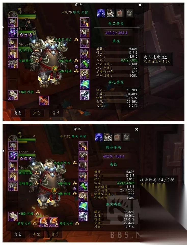 但是 双手的消耗结束读秒为4.08/S 双持的消耗结束读秒为10.48/S (可能存在差异) 结论 在点出风领主下,双持由于消耗速度较快,在AOE战中有较大的优势 [雷霆之拳]的上限层数为10层,根据均秒消耗速度计算 双持武器消耗时间为10.2秒 双手武器消耗为26.2秒 出伤的效率完全不同 虽然风击有40S的无衰减CD,在固定时间下无论手持还是双手 都可以将所有的层数消耗完 但,双手出伤更慢,且这个计算时间内没有并入怒雷,神鹤的读条时间 因此,双持能更高效的打完所有风击层数 又因为,下个版本的附魔较为强大 固,在目前测试下,如无其他调整,踏风双持相比于双手更为灵活 233乐园小编整理的《魔兽世界》10.0武僧悟道心后武器选择推荐内容就到这里了,可能不少网友在游玩这款游戏的时候还存在其他困扰,不解决的话就很影响游戏体验了,那么去哪里可以找到相关内容呢?不要着急,233乐园小编会继续更新更多内容哦!
