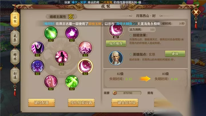 月落西山 月落西山是一个群体控制技能,其冷却时间为30秒,可以使得自身周围3米内的敌人失明。在玄慈指点之后,失明的时间会提升1秒,在80级时,月落西山可以使得敌人失明6.6秒。