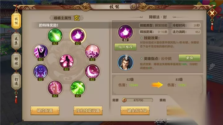 障眼法 障眼法是峨眉的单体控制技能,冷却时间为12秒,在云中鹤指点之后,障眼法的冷却时间会提高8秒,变为20秒。但是失明概率会提升到100%,成为了一个稳定的控制技能。障眼法命中目标后,目标会失明4秒钟。