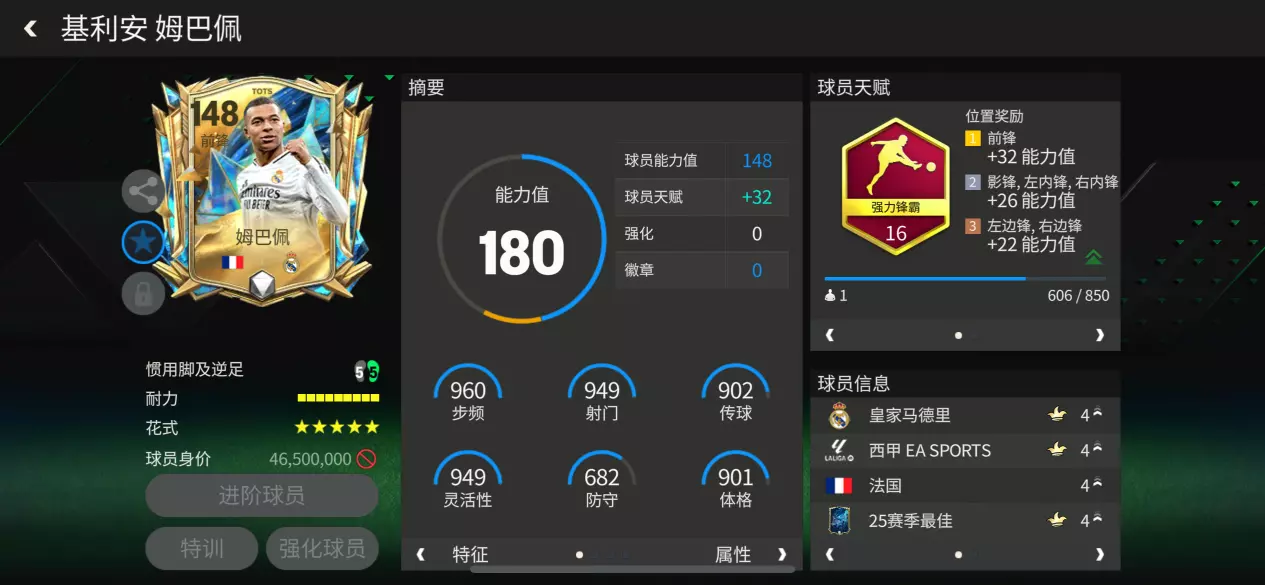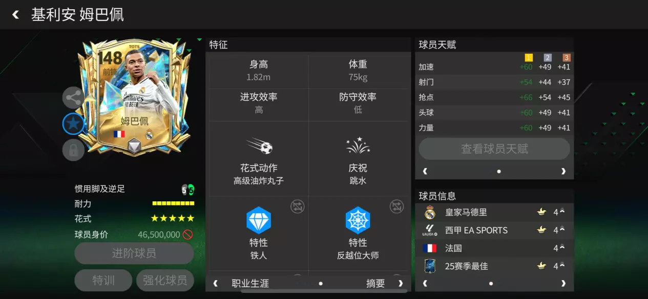 25赛季最佳姆巴佩配备了强力锋霸天赋,对他的加速、射门、抢点、头球和力量这五项数据加成显著,全面强化其在锋线的统治力。耐力给到9格,可以轻松打满全场。五星花式结合脚后跟磕球,反击爆破能力大大加强,高级油炸丸子可以更好地持球盘带。“高+低”的攻守效率使得他的进攻站位极具侵略性。