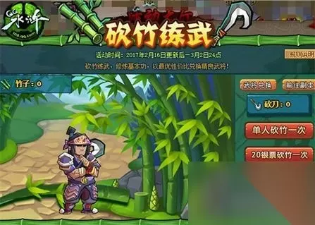 水壶返利礼包 重量级武将登场 全民疯狂招募 《QQ水浒》重磅回馈福利第三招,让“首发武将”和“高级武将”同步登场。2月16日更新后至3月2日24点活动期间,游戏推出“砍竹练武”活动,玩家只需修炼基本功,就能以最优性价比兑换首发武将【真·董澄】。 截止至2月22日24点,15级及以上玩家在招贤馆使用高级武将刷新卡即可有几率刷出武将【红·李忠】。玩家每消耗5个高级武将刷新卡,还可额外免费获得礼品1次,每种礼品限领20次。