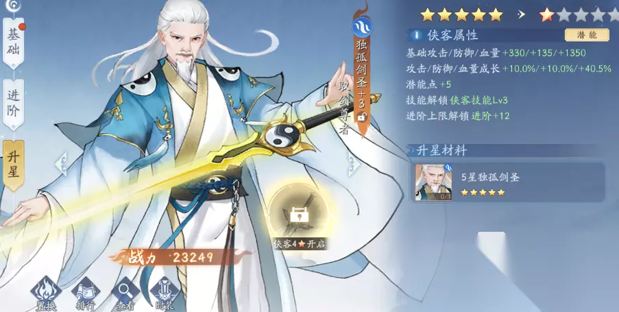 升星需要达到相应的等级,例如初始5星侠客要升星得到70级,没达到是不行的。而且升星必须要本体以及同属性的其他侠客。例如李逍遥初始3星需要同样的3星李逍遥来升星,等到了4星就需要同一属性的侠客了来升了。
