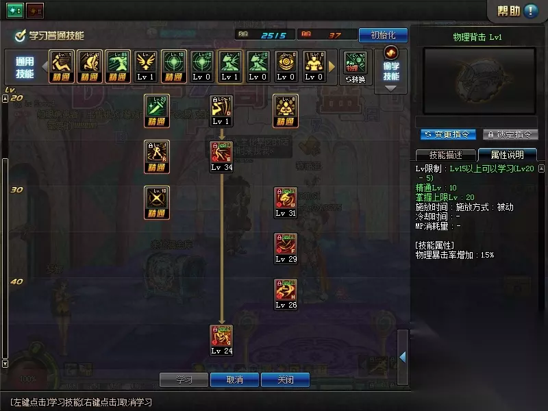 可以保留2360点SP用于学习被动觉醒&60、70EX技能。 契约点的SP也非常富裕,但是相比非契约点,需要选择一个小技能舍弃。 可以考虑舍弃的小技能包括割喉、夺魂、穿心、追命。可以按照个人的习惯进行取舍。模板中给出的推荐是夺魂点1。 理由是夺魂造成的僵直时间与技能等级无关,且在几个小技能中伤害为最低,平时用来连招而不追求输出,故点1即可。 物理暴击/背击这两个被动技能,对于影舞这一高暴击职业,也可以根据人物属性进行适当的调整。