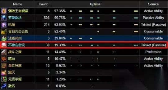海啸护符有常驻属性,是10点命中以及38点暴击等级,它的触发特效为340点攻强,而且这个特效会持续10秒。近战职业的攻击频率照理说要比远程职业高得多,这样的话,海啸护符特效的覆盖几率本该比逆流六分仪高的。可从WCL(一个能反映战斗数据的平台,上面有大量玩家的战斗数据记录)的情况来看,事实却不是这样。