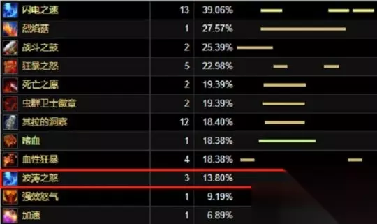 盗贼和狂暴战使用海啸护符的战斗数据,我都分别查看过了。我发现,这两个职业使用海啸护符时,其覆盖率差不多都在13%的样子。那为啥海啸护符的覆盖率这么低呢?实际上啊,是因为它特效的CD持续时间太短了。打个比方,就像一场战斗里,它特效刚触发没一会儿,就又进入冷却了,在整个战斗过程中,能触发特效并发挥作用的时间占比就很小,所以覆盖率就低了。