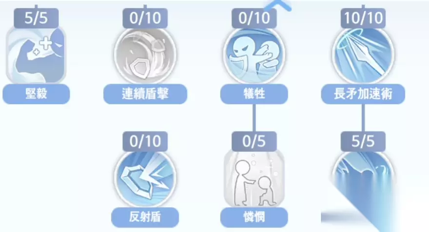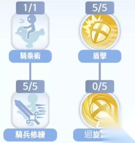接下来二转十字军,首先需要将乘骑术点了,之后盾击点满。骑兵修炼点满,这三个都是为了增强十字军本身的伤害。之后点满信任,神佑之光,天使之躯。从而增加自身的生存能力。然后矛使用熟练度点满,庇护可以点到3,圣十字攻击点满。