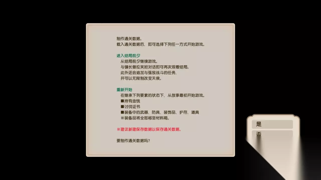 准备好以上素材后制作「梦幻坠饰」; 将梦幻坠饰送去给艾薇拉吧 传送到梦之大树-梦之摇篮触发剧情; 向每个照顾过我们的人打声招呼吧 这里开始无法使用大地图传送,根据小地图到达各处目的地触发剧情; 前往梦之大树看看吧 继续步行到达梦之大树触发剧情; 剧情后主线剧情全部结束。 通关后选择进入结局前夕继续存档内容,会回到第十部分制作完成「梦幻坠饰」之后,出现「与镇长普拉芙妲说话吧」这个进度,到到水晶光辉亭二楼与普拉芙妲对话,这里其实就是没剧情了,如果你告诉镇长没什么事情要做的话会直接进入「向每个照顾过我们的人打声招呼吧」游戏结束阶段,如果你选择是的话就会继续在这个世界里继续完成你没完成的支线人物剧情和其他探索构思配方等,等你觉得都差不多了可以再找镇长说结束游戏阶段保存存档进行二周目等操作。