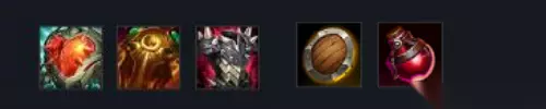 5、出装推荐:【心之钢+日炎护盾+荆棘之甲+铁板靴+多兰之盾+生命药水】