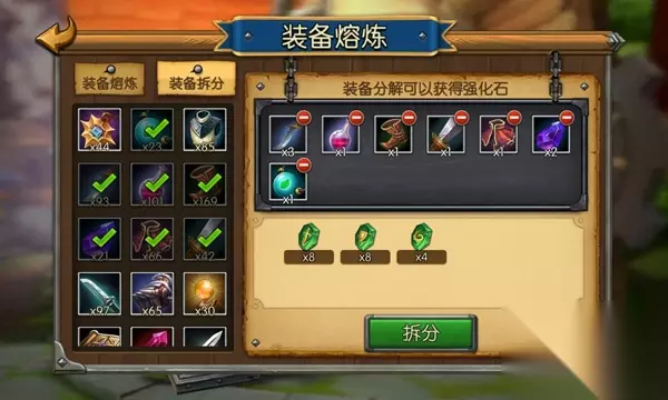 图1:《召唤师联盟》海量英雄培养攻略 快速获取紫装与强化石,打造无敌战甲 装备作为英雄的战甲,是战斗的根本,绿装和蓝装在副本中可以轻松获得,满足玩家刚开始的基本需求。如果进一步提升战斗力的话,关键就在于紫装和强化了。其中,紫装图纸的获取,最快途径便是金币招募和无尽塔,可以得到完整图纸;另外,打普通副本可以得到图纸碎片,然后合成图纸。强化石有绿色、蓝色、紫色,从不同级别的副本掉落,因此要分配好体力,比如扫荡英雄碎片时最好选择等级匹配的强化石,可以做到两不耽误;另外,在商店铁匠处可免费将装备分解成强化石,只要你有足够装备,就可以快速得到各种强化石,强化石的属性与装备自身属性相对应。