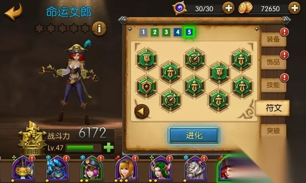 图3:《召唤师联盟》分解装备得强化石 六大途径轻松得符文,助力英雄进化 符文不但可以为英雄附加各种属性,更是影响英雄进化养成的重要因素之一,该玩法是为每个英雄独立定制的英雄强化系统。任何品阶的英雄最终都可升级为紫色稀有,届时英雄将拥有7页符文,不同英雄每页的符文镶嵌也不同,只有当页符文镶满后英雄才能进化。玩家可以通过精英副本、无尽塔、天梯积分、每日任务宝箱、大转盘、铁匠合成精华符文等多种方式快速获得符文。符文获得越快,英雄进化越快,便可以学习更多技能,极大提升英雄战斗力。
