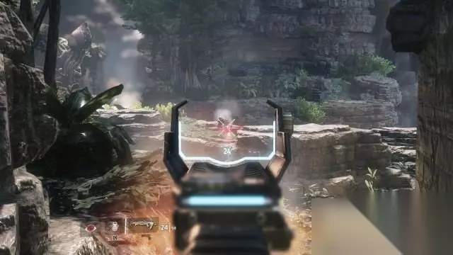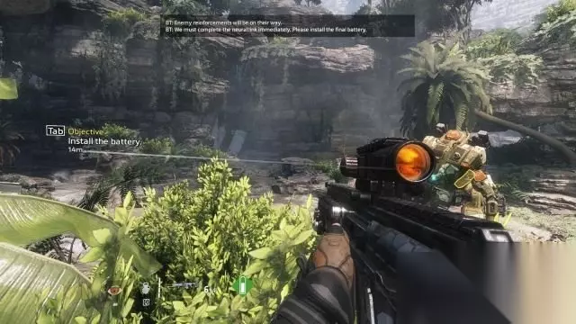 step14.这次在BT身边会出现无人机以及机械兵,先与BT保持距离,靠近便容易被敌人射杀。 躲在BT正面的岩石上借助树丛作为掩体对敌人进行射击。 然后就可以为BT安装上最后一个电池,接着按住E键登上泰坦。