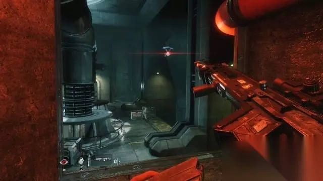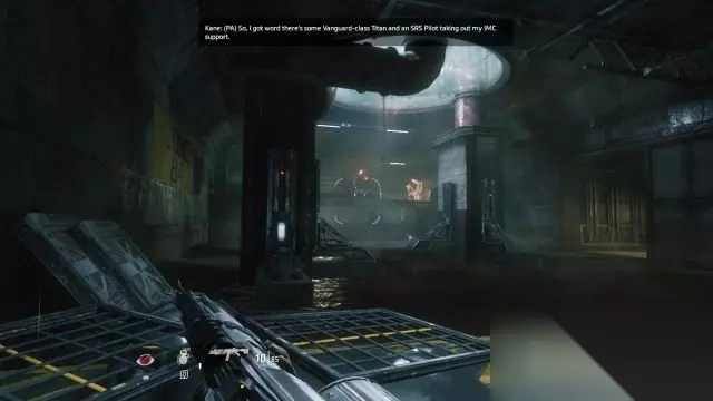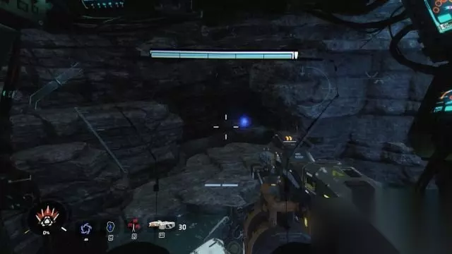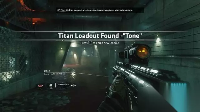 step3.进入到大坝内,可以捡起一把新武器给BT,留意右侧通道有条成“7”字型的管道。 按住E键下泰坦后,去到管道的后方,使用跳跃爬到管道上(从正面无法登上管道),从管道进入到红色区域跳落至BT所在通道左侧的铁丝网所保护的区域内,在这里可以捡到本章节第一个铁驭头盔(1/6)。