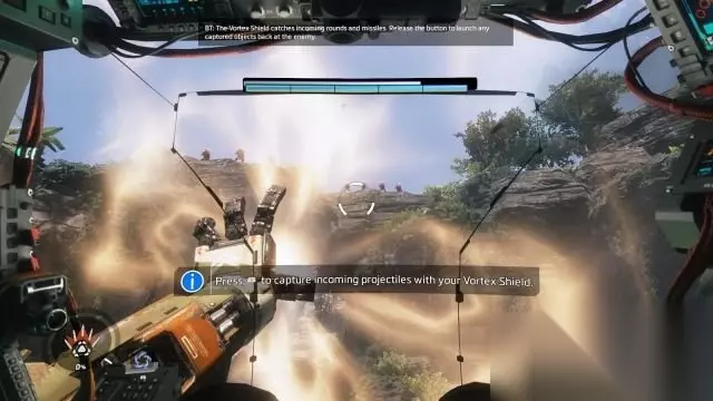step15.首先要学习一些泰坦的操作,摁住鼠标滑轮使用漩涡盾,吸住敌人的子弹,瞄准山上的机械兵,松开鼠标滑轮就可以将它们的子弹反弹回去。 然后就是使用Q键的飞弹锁定机械兵和无人机,将它们击落。