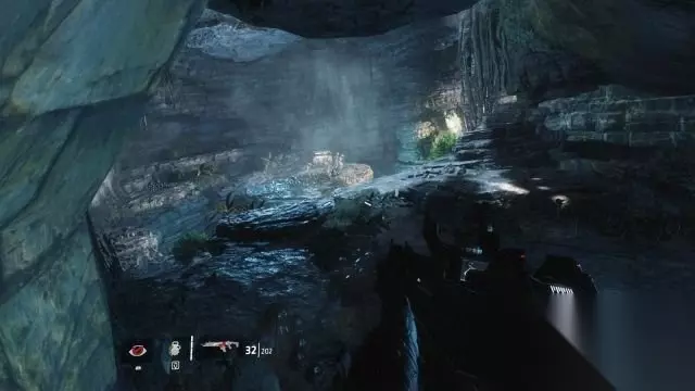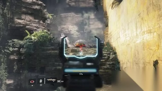 step7.在瀑布岩洞上方会有使用长弓的机械兵攻击Cooper。 从刚才四名守卫身旁的武器箱取出长弓,长弓是轻狙,爆头的话铁驭会毙命的,但打在身上需要两枪才能杀敌。 借助岩洞墙壁作为掩体对上方的机械兵进行爆头,第二批机枪兵是使用步枪,它们会主动跳下来,这时候清理掉它们即可。