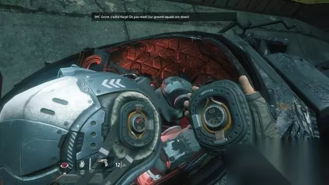 step4.处理完两只猎犬后会进入到山谷,左侧会发现到一个反抗军的逃生舱,在旁边可以发现到本章节第一个铁驭头盔(1/2)。 随后穿过瀑布进入到岩洞,沿着瀑布往上爬,经过一个发出橙色光的飞船残骸时,摁下鼠标滑轮发动隐身,从后击飞三名巡逻的IMC步兵(他们都是背身),前方有一名朝往Cooper方向巡逻的守卫,马上上前将其击飞。 在这里千万不要引发,否则在前方战舰坠毁点处的大批IMC守卫就会疯狂地向Cooper射击。