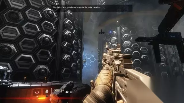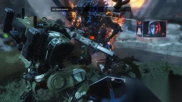 step14.穿过一座山来到一个村子就要面对BOSS――Ash,她使用带大刀的游侠泰坦。 如果她近身,BT就需要后退躲避,不宜出拳,毕竟拳头攻击距离比不上大刀。 如果Ash无法近身,那么开启粒子墙远距离射击Ash的核心,几枪就可以灭掉她,接着进入隧道即可。