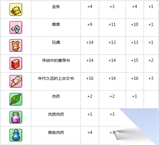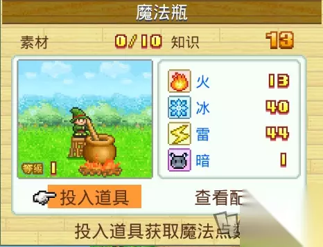 玩家在举办活动中花费100点城镇点数就可以解锁魔法瓶,菜单栏里会以开发形式出现魔法瓶。 玩家在魔法瓶里可以积累一定的魔法点数,自行炼制装备、道具等等物品,魔法点数则可以通过战斗或是商店得到的道具来换,反复研究之后还能入手新的配方。 道具对应效果 由于道具的一次性原则,本着绝对不浪费一丝一毫的宗旨,小编建议大家按照下面的列表投喂魔法瓶,得到最高性价比的结果。 效果一览