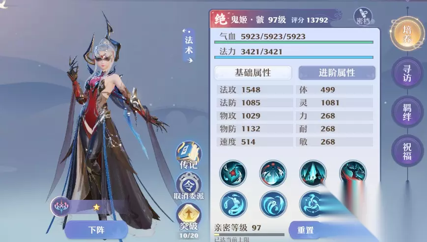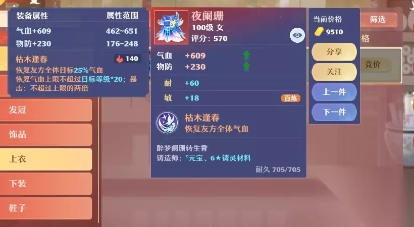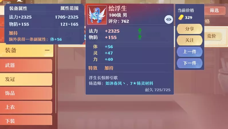 然后是装备特效,武器推荐祝福、成长、加持类特效的双加百炼装。发冠推荐加持。饰品推荐体魄、加持。上衣推荐加持或者成长。下装自然是灵慧,但可遇不可求,低等级的也能凑合使用。鞋子推荐加持、抗封、疾风。属性方面优先体、耐、敏。