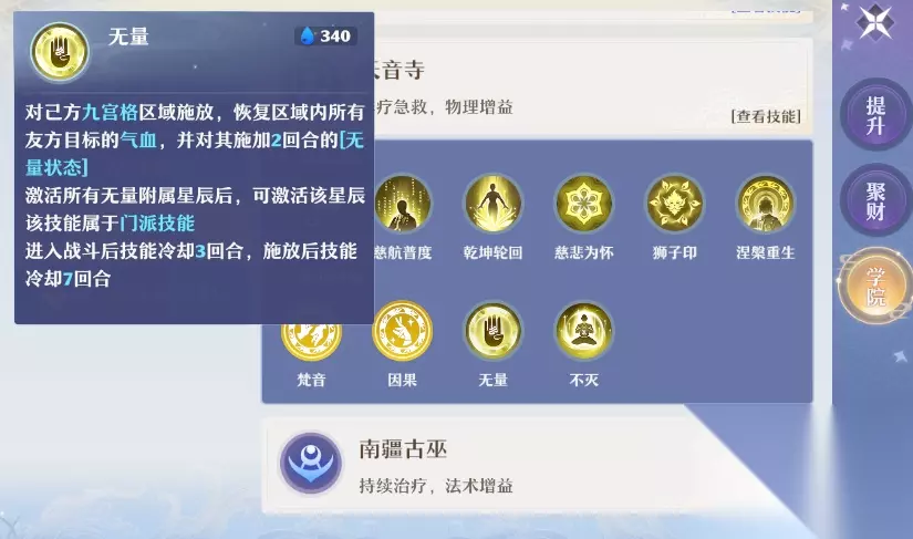 天书推荐: 梵音狮子印物攻加成效果提升25%,因果提高涅槃复活时的气血上限。因果比较泛用。但如果有固定队且队伍中物理门派很强势,也可以使用梵音。 无量群体回血加2回合减伤,不灭则是复活友方单体大量气血与内伤,并临时提高双防同时施加涅槃状态。无量的收益更大,使用更多,单体复活让灵兽来就可以了。 以上就是梦幻新诛仙天音寺攻略的相关内容,打造一个合格的天音可不是那么简单的呢!道友们有什么好的建议,也可以在评论区留言一起讨论哦!