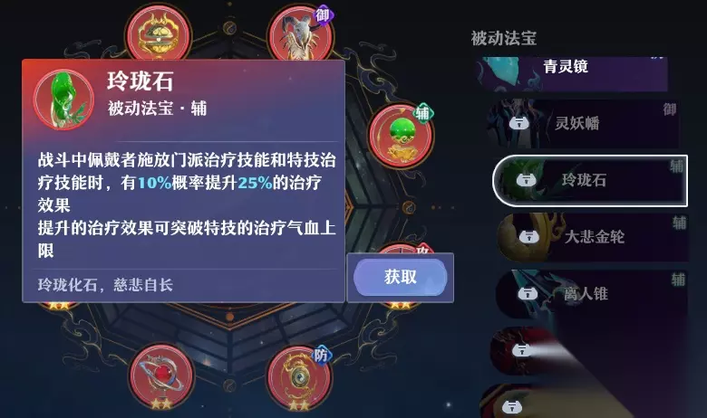 法宝推荐: 主动法宝,玉净瓶或者饶雪炉+乾坤戒+浮屠金钵+九品金莲。乾坤戒与浮屠金钵这两样法宝是天音必备的,其它的则视情况而定。像是元素法在在兽神挑战中使用较多,九品金莲则是PVP中使用得多。 被动法宝,兽骨幡或者灵妖幡,加鹤云幡、青灵镜、玲珑石。加灵兽伤害、加自身速度、法术防御、治疗。其中玲珑石血炼减怒效果。