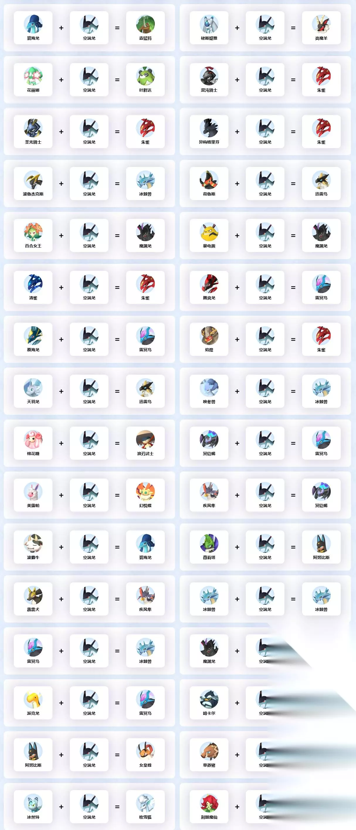 详细介绍: 子代: 111空涡龙+111空涡龙=111空涡龙 父母代: 46月镰魔+111空涡龙=11企丸王 69博爱蜥+111空涡龙=11企丸王 87花丽娜+111空涡龙=33叶胖达 57吹雪狐+111空涡龙=38疾风隼 60霹雳犬+111空涡龙=38疾风隼 68猫蝠怪+111空涡龙=38疾风隼 20草莽猪+111空涡龙=40炎魔羊 31鲨小子+111空涡龙=40炎魔羊 31B红小鲨+111空涡龙=40炎魔羊 44黑鸦隐士+111空涡龙=40炎魔羊 45朋克蜥+111空涡龙=40炎魔羊 45B热血蜥+111空涡龙=40炎魔羊 63秘斯媞雅+111空涡龙=40炎魔羊 36美露帕+111空涡龙=41幻悦蝶 43趴趴鲶+111空涡龙=41幻悦蝶 3皮皮鸡+111空涡龙=42炽焰牛 16壶小象+111空涡龙=42炽焰牛 24喵斯特+111空涡龙=42炽焰牛 40B暗魔羊+111空涡龙=51女皇蜂 100阿努比斯+111空涡龙=51女皇蜂 35灌木羊+111空涡龙=52笑魇猫 75暗巫猫+111空涡龙=54毛老爹 84狱焰王+111空涡龙=54毛老爹 8新叶猿+111空涡龙=56雷角马 23勾魂鱿+111空涡龙=56雷角马 28波娜兔+111空涡龙=56雷角马 81水灵儿+111空涡龙=56雷角马 81B火灵儿+111空涡龙=56雷角马 4翠叶鼠+111空涡龙=57吹雪狐 14玉藻狐+111空涡龙=57吹雪狐 24B冰丝特+111空涡龙=57吹雪狐 32B冰缚灵+111空涡龙=57吹雪狐 71B霜歌龙+111空涡龙=58火麒麟 72浪刃武士+111空涡龙=58火麒麟 12雷棘鼠+111空涡龙=60霹雳犬 12B冰刺鼠+111空涡龙=60霹雳犬 15啼卡尔+111空涡龙=60霹雳犬 17瞅什魔+111空涡龙=60霹雳犬 47天擒鸟+111空涡龙=65滑水蛇 48羽箭射手+111空涡龙=65滑水蛇 5火绒狐+111空涡龙=68猫蝠怪 7伏特喵+111空涡龙=68猫蝠怪 32吊缚灵+111空涡龙=68猫蝠怪 70融焰娘+111空涡龙=68猫蝠怪 13叶泥泥+111空涡龙=71烽歌龙 19寐魔+111空涡龙=71烽歌龙 22遁地鼠+111空涡龙=71烽歌龙 62雷鸣童子+111空涡龙=71烽歌龙 9燎火鹿+111空涡龙=72浪刃武士 21露娜蒂+111空涡龙=72浪刃武士 34棉花糖+111空涡龙=72浪刃武士 66噬魂兽+111空涡龙=72浪刃武士 76焰巫狐+111空涡龙=72浪刃武士 33B雷胖达+111空涡龙=73迅雷鸟 51女皇蜂+111空涡龙=73迅雷鸟 58火麒麟+111空涡龙=73迅雷鸟 74燧火鸟+111空涡龙=73迅雷鸟 88熔岩兽+111空涡龙=73迅雷鸟 92铠格力斯+111空涡龙=73迅雷鸟 95天羽龙+111空涡龙=73迅雷鸟 105荷鲁斯+111空涡龙=73迅雷鸟 56雷角马+111空涡龙=74燧火鸟 71烽歌龙+111空涡龙=74燧火鸟 84B狱阎王+111空涡龙=74燧火鸟 39姬小兔+111空涡龙=75暗巫猫 53毛掸儿+111空涡龙=75暗巫猫 42炽焰牛+111空涡龙=79绸笠蛾 55疾旋鼬+111空涡龙=79绸笠蛾 64花冠龙+111空涡龙=79绸笠蛾 64B雷冠龙+111空涡龙=79绸笠蛾 48B山岳射手+111空涡龙=80精灵龙 77踏春兔+111空涡龙=80精灵龙 93云海鹿+111空涡龙=80精灵龙 94夜幕魔蝠+111空涡龙=80精灵龙 29波霸牛+111空涡龙=82碧海龙 37紫霞鹿+111空涡龙=82碧海龙 37B祇岳鹿+111空涡龙=82碧海龙 83冰棘兽+111空涡龙=83冰棘兽 97雷冥鸟+111空涡龙=83冰棘兽 98魔渊龙+111空涡龙=83冰棘兽 106波鲁杰克斯+111空涡龙=83冰棘兽 110唤冬兽+111空涡龙=83冰棘兽 110.2唤夜兽+111空涡龙=83冰棘兽 6冲浪鸭+111空涡龙=84狱焰王 10企丸丸+111空涡龙=84狱焰王 27炸蛋鸟+111空涡龙=84狱焰王 30荆棘魔仙+111空涡龙=84狱焰王 41幻悦蝶+111空涡龙=85佩克龙 79绸笠蛾+111空涡龙=85佩克龙 89君王美露帕+111空涡龙=85佩克龙 91白绒雪怪+111空涡龙=85佩克龙 91B绿苔绒怪+111空涡龙=85佩克龙 1棉悠悠+111空涡龙=87花丽娜 2捣蛋猫+111空涡龙=87花丽娜 18米露菲+111空涡龙=87花丽娜 65滑水蛇+111空涡龙=88熔岩兽 65B流沙蛇+111空涡龙=88熔岩兽 67碎岩龟+111空涡龙=89君王美露帕 52笑魇猫+111空涡龙=90森猛犸 82碧海龙+111空涡龙=90森猛犸 61苍焰狼+111空涡龙=91白绒雪怪 86B海誓龙+111空涡龙=91白绒雪怪 25鲁米儿+111空涡龙=91B绿苔绒怪 59严冬鹿+111空涡龙=91B绿苔绒怪 86连理龙+111空涡龙=91B绿苔绒怪 40炎魔羊+111空涡龙=92铠格力斯 85佩克龙+111空涡龙=97雷冥鸟 85B派克龙+111空涡龙=97雷冥鸟 90森猛犸+111空涡龙=97雷冥鸟 90B雪猛犸+111空涡龙=97雷冥鸟 99冥铠蝎+111空涡龙=97雷冥鸟 101覆海龙+111空涡龙=97雷冥鸟 101B腾炎龙+111空涡龙=97雷冥鸟 58B邪麒麟+111空涡龙=98魔渊龙 73迅雷鸟+111空涡龙=98魔渊龙 88B寒霜兽+111空涡龙=98魔渊龙 103暴电熊+111空涡龙=98魔渊龙 104百合女王+111空涡龙=98魔渊龙 104B黑月女王+111空涡龙=98魔渊龙 33叶胖达+111空涡龙=99冥铠蝎 38疾风隼+111空涡龙=99冥铠蝎 54毛老爹+111空涡龙=99冥铠蝎 89B冰帝美露帕+111空涡龙=99冥铠蝎 26猎狼+111空涡龙=100阿努比斯 49铁拳猿+111空涡龙=100阿努比斯 50骑士蜂+111空涡龙=100阿努比斯 78薇莉塔+111空涡龙=100阿努比斯 11企丸王+111空涡龙=101覆海龙 80精灵龙+111空涡龙=101覆海龙 80.2水灵龙+111空涡龙=101覆海龙 96焰煌+111空涡龙=102朱雀 102朱雀+111空涡龙=102朱雀 102B清雀+111空涡龙=102朱雀 107异构格里芬+111空涡龙=102朱雀 108圣光骑士+111空涡龙=102朱雀 109混沌骑士+111空涡龙=102朱雀 111空涡龙+111空涡龙=111空涡龙 以上就是空涡龙配种公式大全的所有的内容了,给大家提供了空涡龙子代和父母代的配种攻略,希望可以帮助到大家。
