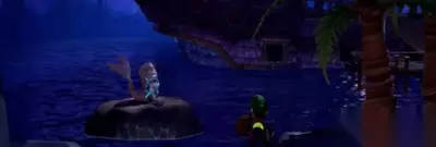 2、第2颗宝石位于海滩边的人鱼雕像。先用「吸尘器」把树上的椰子吸下来,接着利用椰子把人鱼雕像砸坏,砸满3次就会出现「宝石鬼怪」,打败它获得宝石。