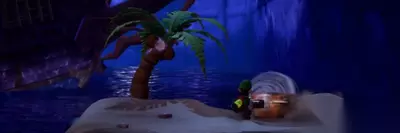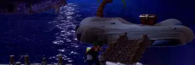 4、第4颗宝石位于海滩的右侧。使用「暗光灯」照出两座隐藏的木桥,走到尽头的小岛上,用「吸尘器」吹开沙子露出埋着的宝箱,打开宝箱获得宝石。