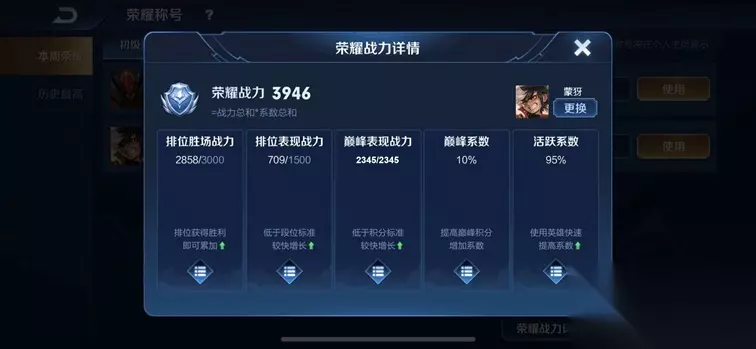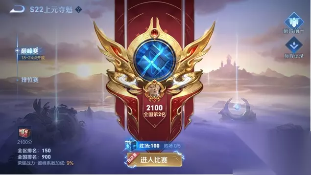 2.新增上局高光战绩炫耀 1)当召唤师在上一局表现优异时,会存储使用英雄上一局的击杀、死亡、助攻数及比赛称号数据;、 2)比赛称号按照按五连绝世>超神>金牌>胜方MVP的优先级进行存储; 3)在下一次相同类型的比赛模式选中该英雄后即可向其他召唤师炫耀该英雄的上局战绩; 4)功能仅应用于排位赛与巅峰赛,且数据分开存储,模式之间互不影响; 三、巅峰赛 (一)开启时间调整 巅峰赛的开启时间将根据召唤师的当前巅峰积分进行动态限制: 0-2099巅峰积分:每日12点-24点开放 2100巅峰积分及以上:每日18点-24点开放 (二)全国排名争夺