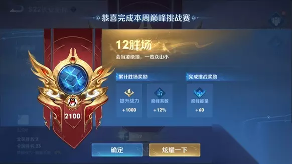 参与奖励如下: 1)巅峰战力:在挑战赛中每胜利一场使用的英雄会额外获得100巅峰战力,单英雄额外战力上限为1200,下周一荣耀称号结算后清空,且不计入国服最强的排行榜; 2)巅峰系数:在挑战赛中每胜利一场会获得1%巅峰系数,上限为12%,下周一荣耀称号结算后清空,且不计入国服最强的排行榜; 3)巅峰能量:在完成挑战赛之后会根据最终胜场数获得巅峰能量奖励,赛季结束后清空; (四)英雄战力规则调整 1.上限规则调整 为避免赛季更新后继承下来的巅峰表现战力远远高于上限,导致召唤师在赛季初期不敢使用擅长英雄参与巅峰赛的情况,我们优化了巅峰表现战力了上限规则