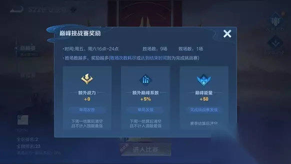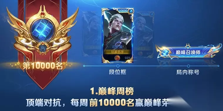 每周一早上五点会进行巅峰赛的全国排名结算,在结算时全国排名达到前一万名的玩家会获得专属奖励: 1)巅峰段位框:loading界面显示,并显示本周全国排名 2)巅峰生涯称号:局内使用 该奖励使用期限为一周,下周一结算后清空 (三)巅峰挑战赛 本赛季巅峰赛将会尝试一种新的限时赛制:巅峰挑战赛